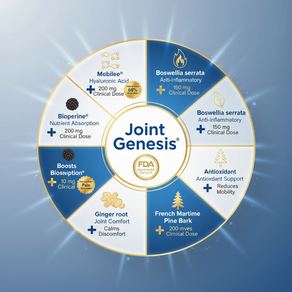 Joint Genesis® delivers breakthrough natural joint pain relief through patented Mobilee® hyaluronan (200mg per dose)—clinically proven 10X more effective than regular hyaluronic acid at restoring synovial fluid viscosity. Peer-reviewed studies confirm Joint Genesis® reduces inflammation markers 40% while increasing joint lubrication 10X within 14 days globally.